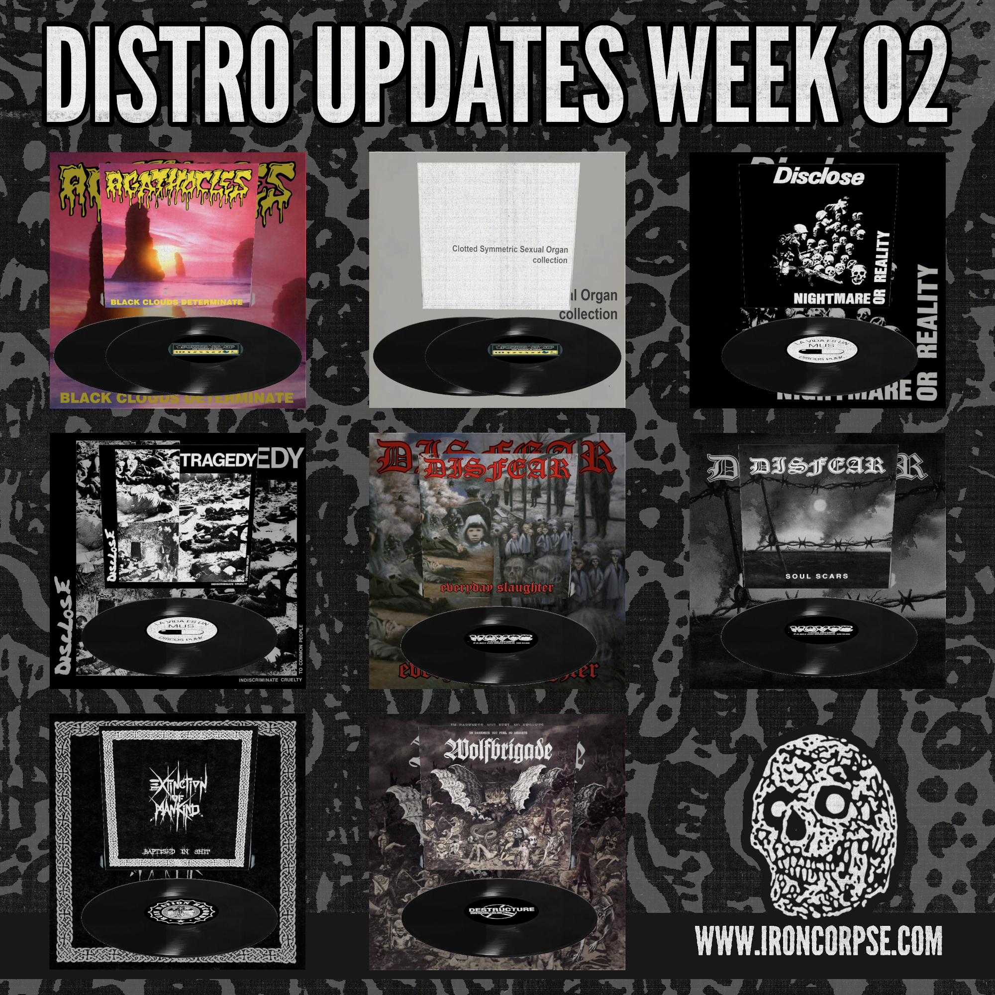 GRIND & DISTORT – This week is filled with heavy crustocore and goregrindind insanity with the repress of AGATHOCLES classic “Black Clouds Determinate” on 2LP vinyl, C.S.S.O. discography collection on vinyl and the classic heavy crust albums of EXTINCTION OF MANKIND and WOLFBRIGADE. Restocks on DISCLOSE and DISFEAR vinyl.
