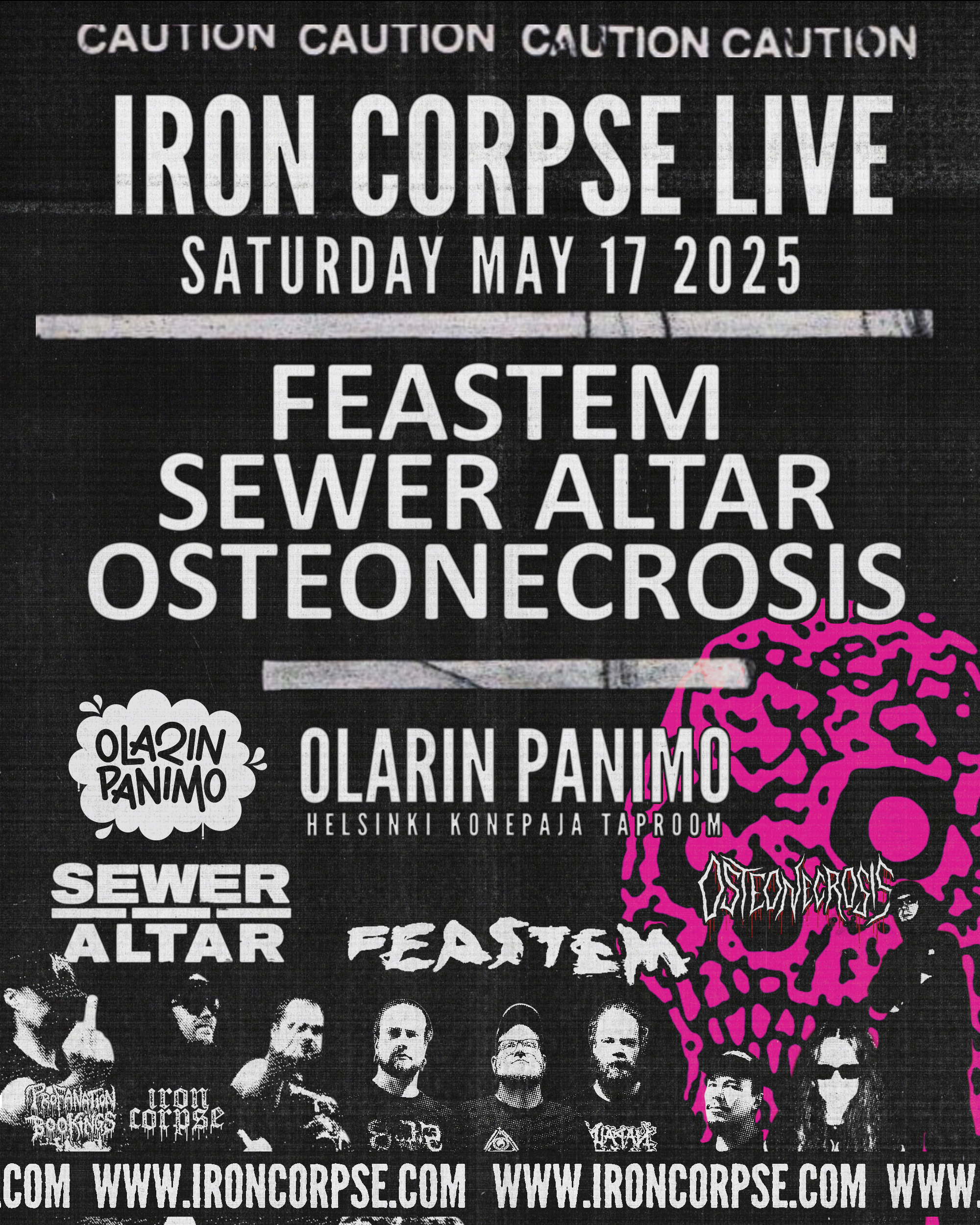 IRON CORPSE in association with OLARIN PANIMO BREWERY presents: Saturday 17.05.2025Olarin Panimo, Konepaja Taproom (Bruno Granholminkuja 1) An evening with grinding deathmetal and superb quality beers from one of the top breweries in Finland! + FEASTEMPlutonium powered grindcore punkhttps://feastem.bandcamp.com/https://feastem.com/ + SEWER ALTARGrinding deathmetal / hardcorehttps://seweraltar.bandcamp.com/ + OSTEONECROSISSlamming brutal gore deathmetalhttps://osteonecrosisgore.bandcamp.com/…