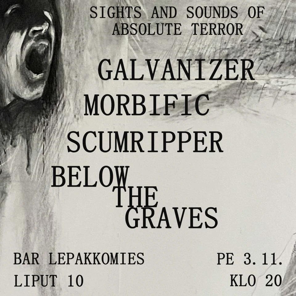 Copies can be also picked up locally at the “SIGHTS AND SOUNDS OF ABSOLUTE TERROR” gig the same day with GALVANIZER, MORBIFIC, SCUMRIPPER, BELOW THE GRAVES in Lepakkomies, Helsinki.