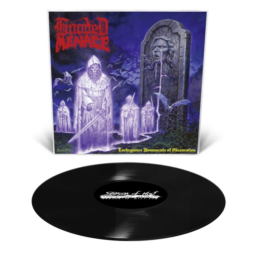 Lachrymose Monuments of Obscuration hammers home the ‘80s heavy metal influence that Hooded Menace rung in on The Tritonus Bell. As if from a trance, drums snap into a gallop amidst blistering leads drip with neon. MicroPitching and other effects aren’t the only tricks pulled out from under the band’s cloak, either. What should appear from the double bass swirling beneath lead single “Portrait Without a Face” but the deeply haunting moan of a cello. With Lachrymose Monuments of Obscuration, Hooded Menace cast death-doom in a ghostly new light. Artwork by Wes Benscoter.