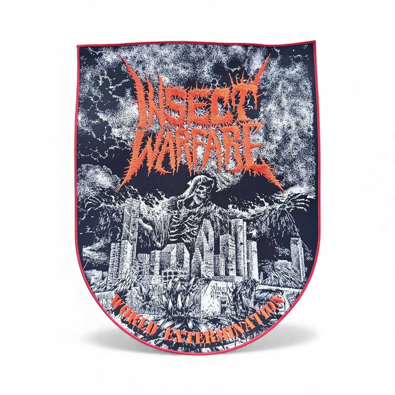 This one is a traditional backpatch with stiched borders. The logo and the title text are in thick and heavy embroidery, which makes to bottom fabric warp in the picture.