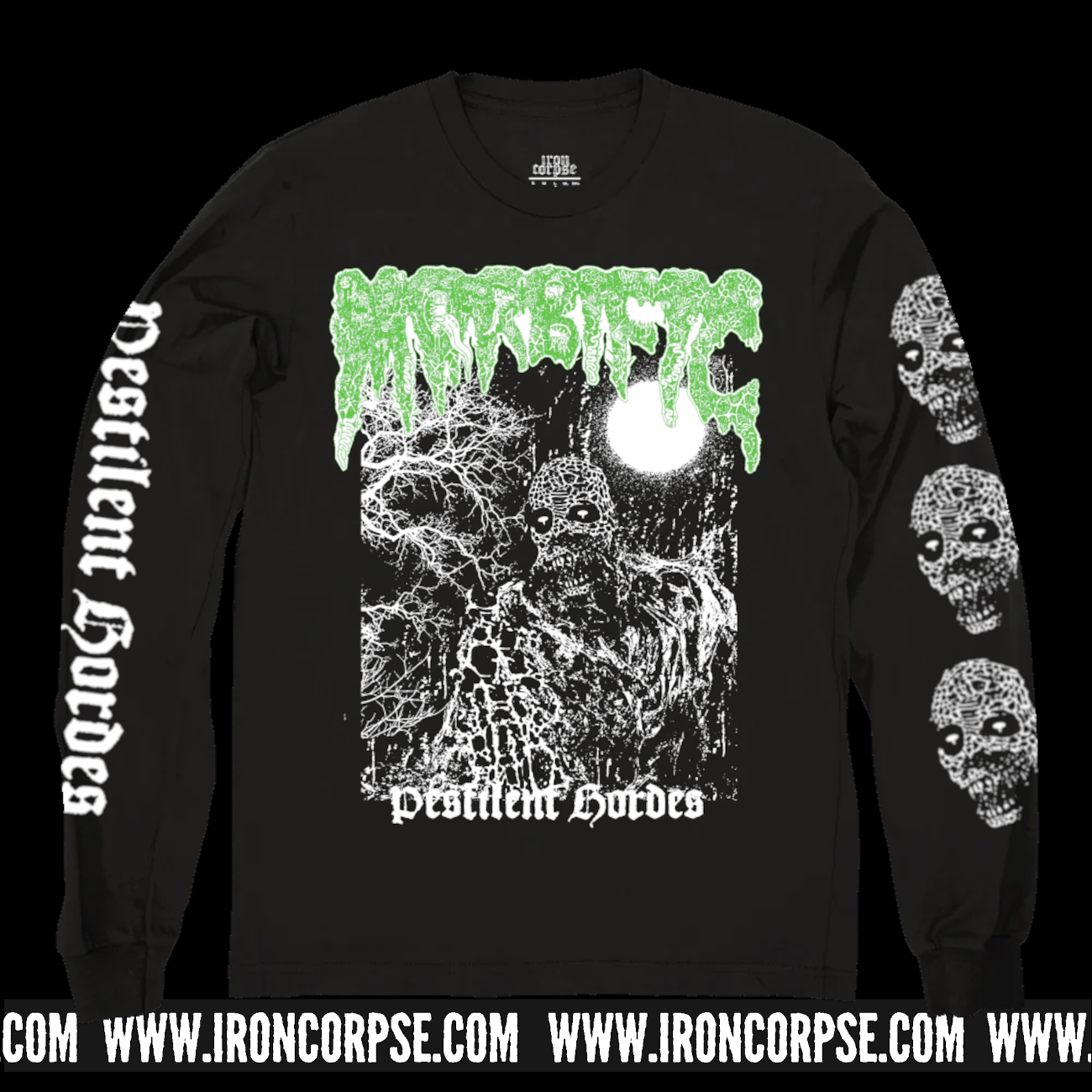 Revamped artwork from the “Pestilent Hordes” demo, with bright neon green and white print. Big sleeveprints with the title text and three huge necro skulls.