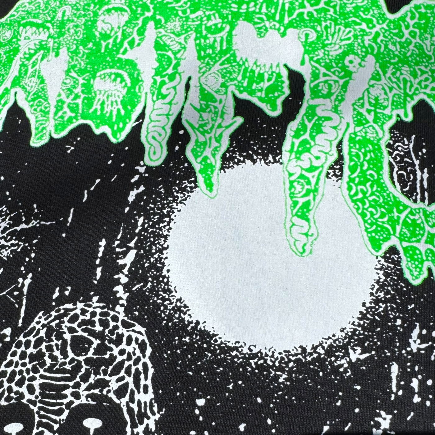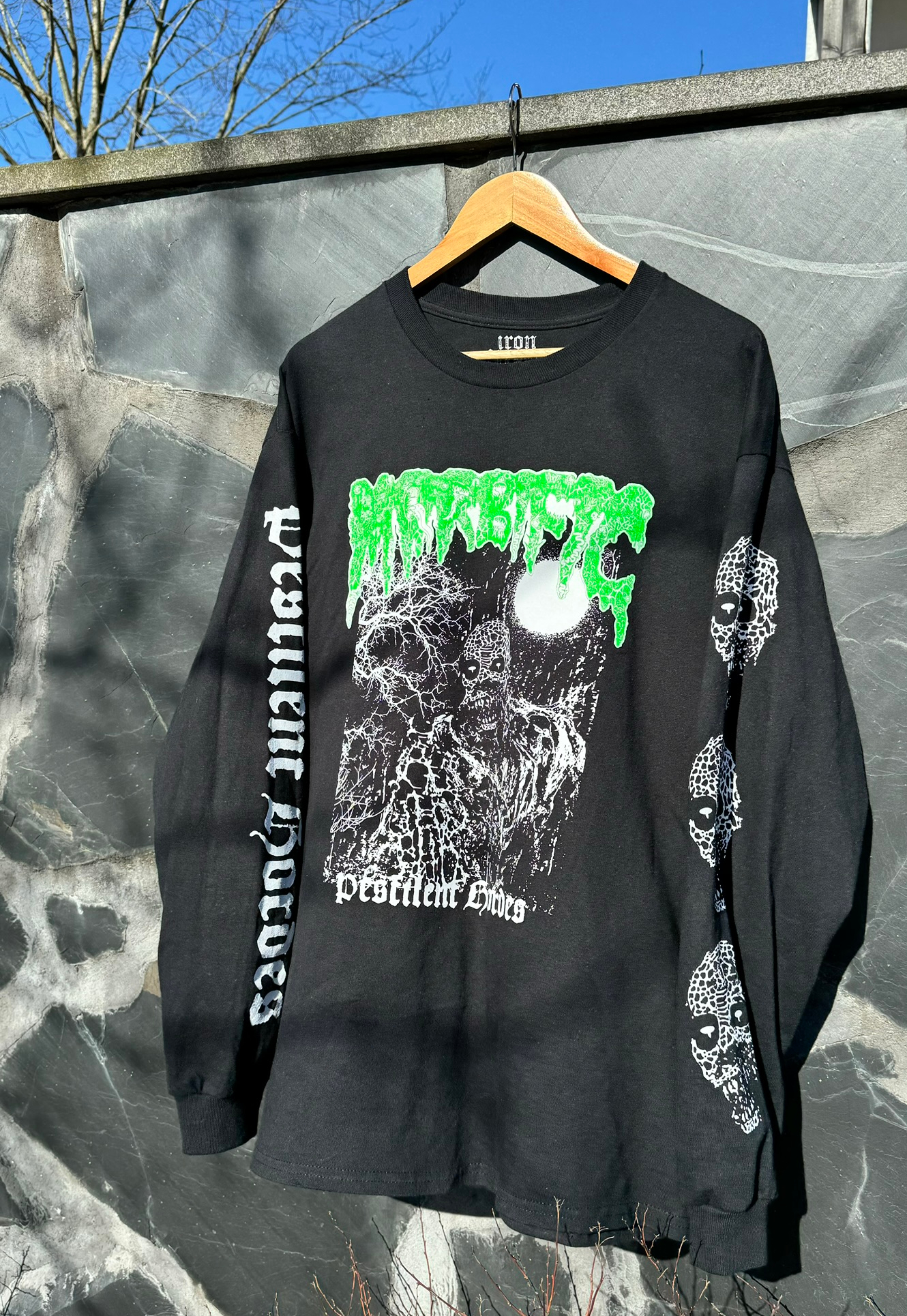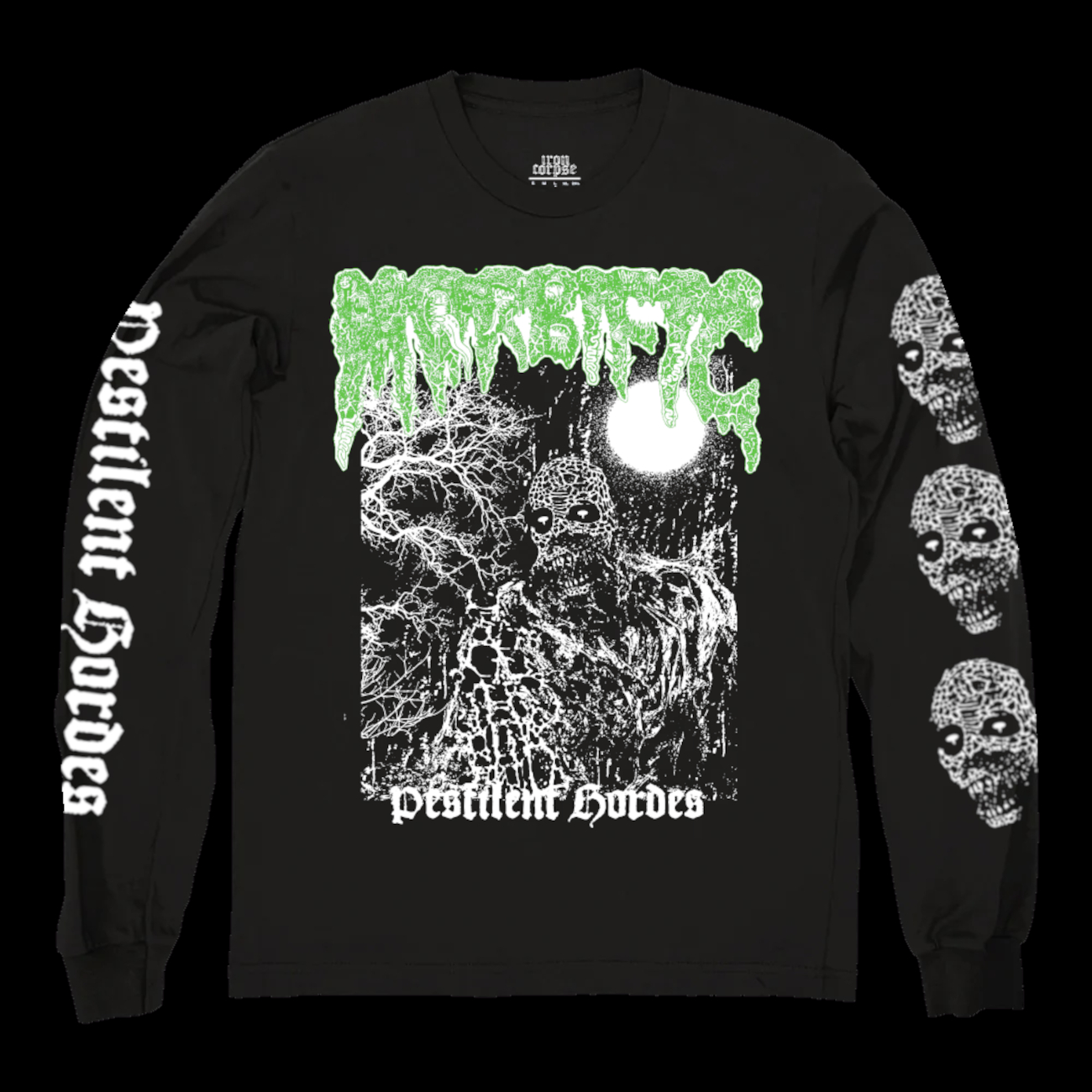 Revamped artwork from the “Pestilent Hordes” demo, with bright neon green and white print. Big sleeveprints with the title text and three huge necro skulls.