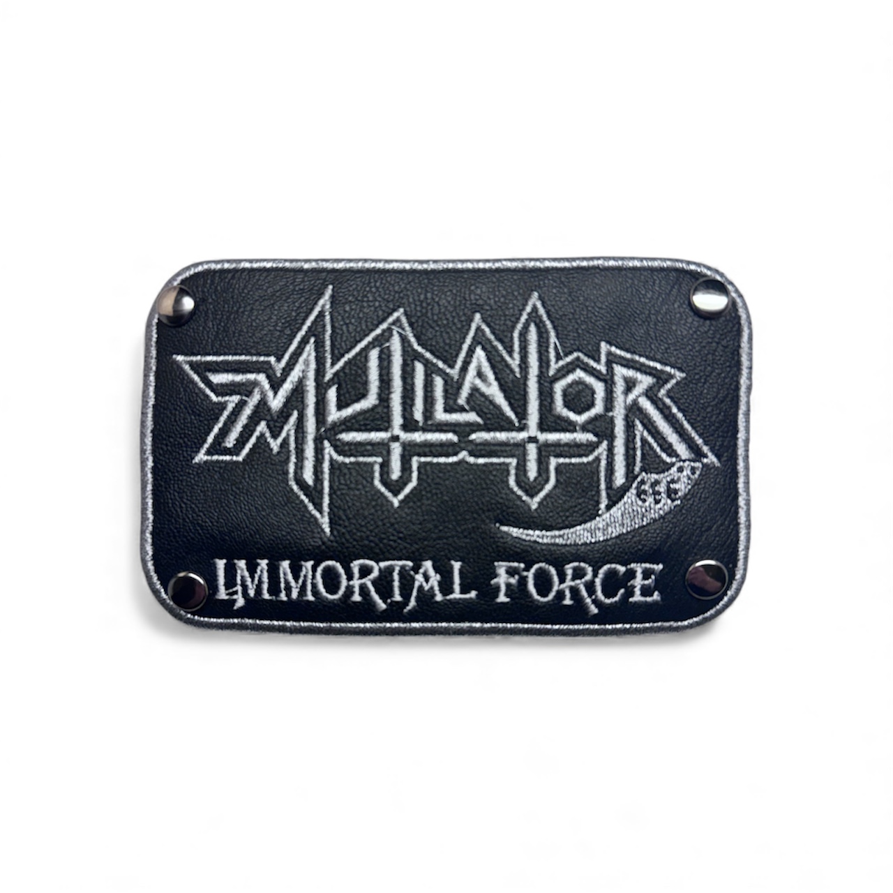 This one is patch with stiched borders, embroidered on faux leather material that 100% imitates real leather. Rivets attached in each corner.