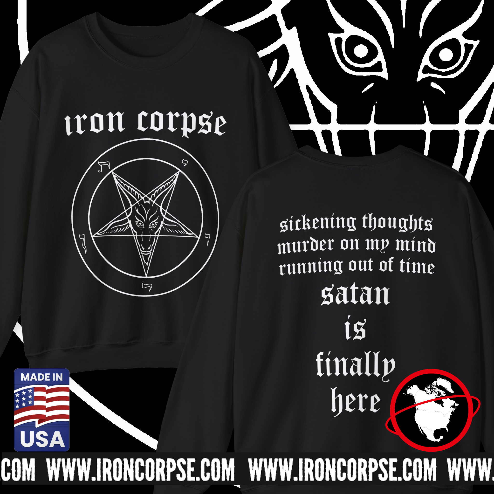 SATAN IS FINALLY HERE CREWNECK BLACK (S-3XL) (PRINT ON DEMAND) – NORTH AMERICA