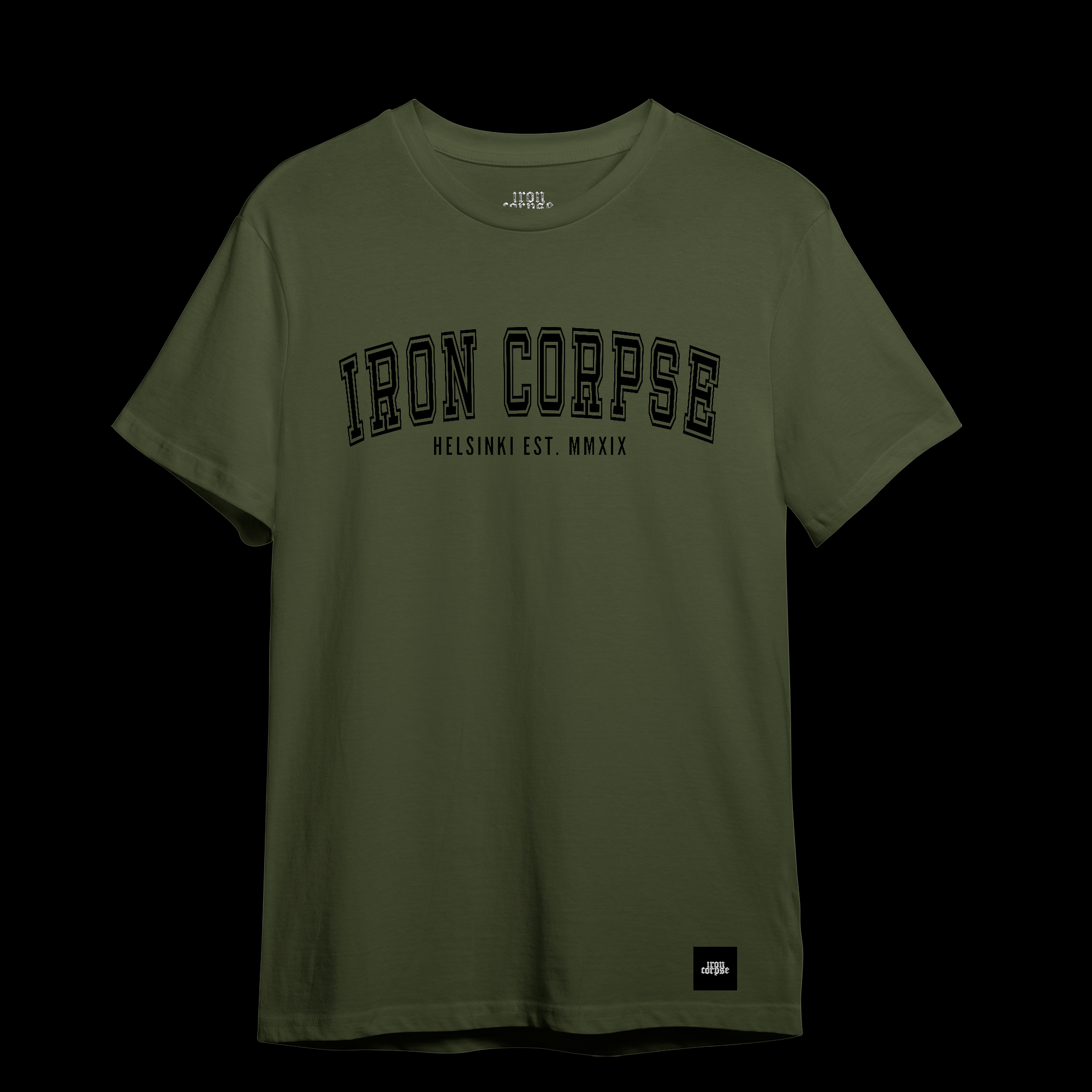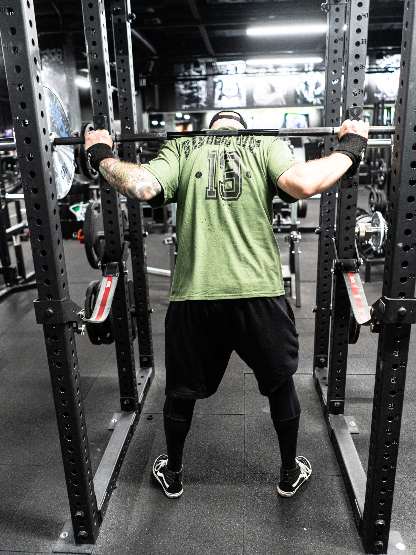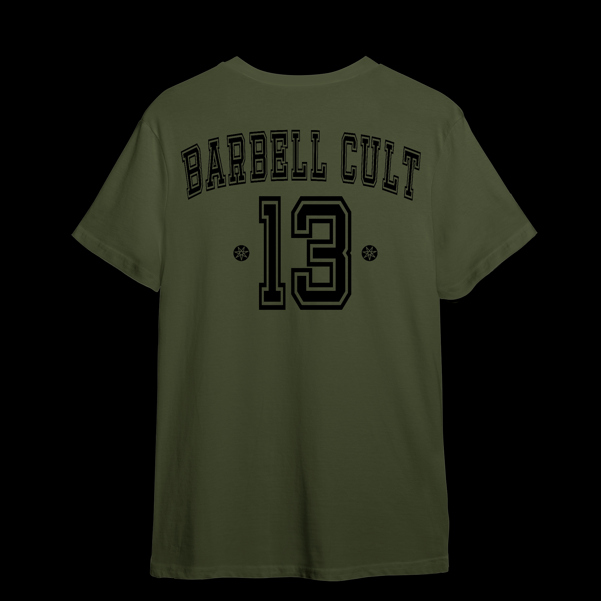 VARSITY 13 is a homage to the long history of varsity graphics in lifting apparel as well as in hardcore bandshirts. Bold arched logo print on front and back.