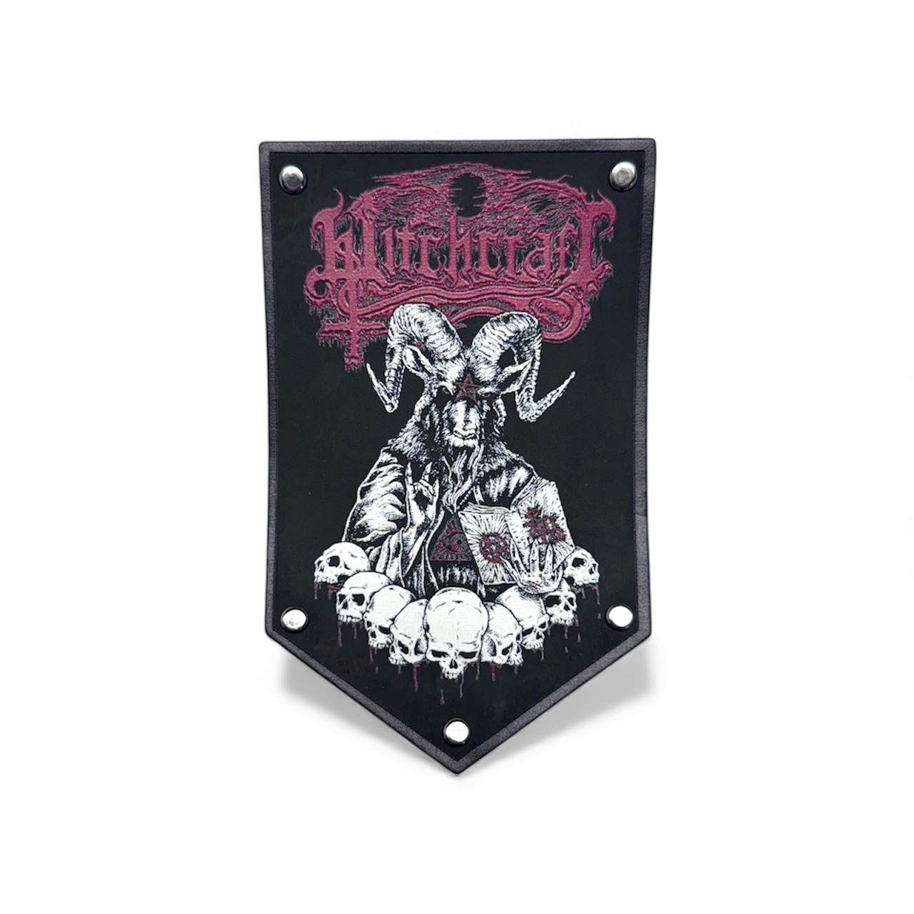This one is a laser patch cut without stiched borders, printed on a faux leather material. The patch has five rivets, one attached to each corner.